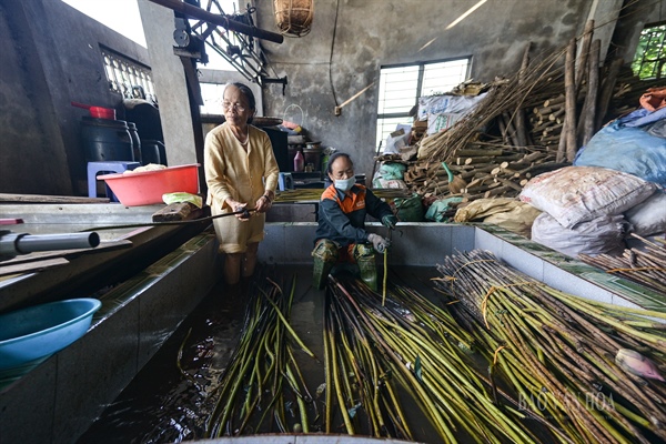 Sau khi được ngắt trực tiếp từ đầm lên sẽ được rửa sạch qua hai lần nước cho hết bùn và gai.