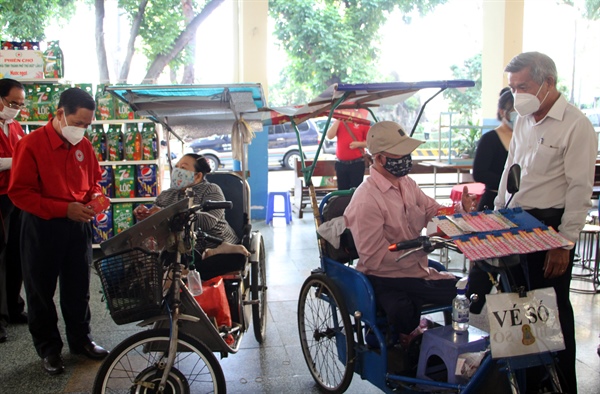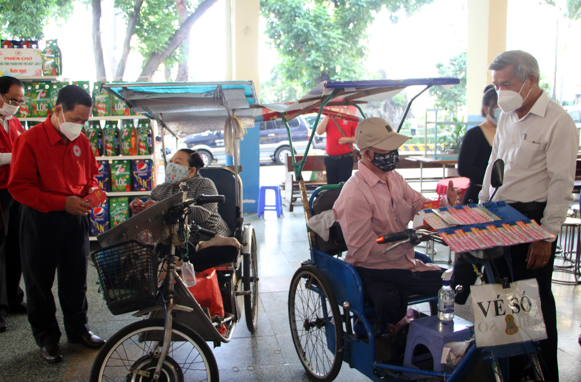 Ông Trần Văn Tuấn, Phó Chủ tịch Hội Chữ thập đỏ TP.HCM và ông Cao Văn Minh, Trưởng Ban Dân vận Thành ủy Thủ Đức trao quà cho những người khuyết tật làm nghề bán vé số