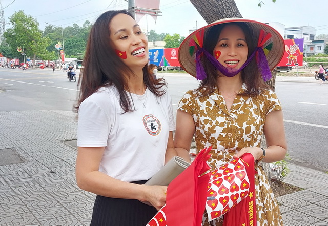 Trong lúc chờ vào sân, chị Việt (bên phải) cùng em gái cho biết tranh thủ bán cờ và băng rôn. Từ đầu giải đến giờ, chị bán được khoảng 100 sản phẩm. "Lờ lãi không đáng là bao. Nhưng vui và hưởng không khí mà không phải lúc nào cũng có được.", chị Việt nói.