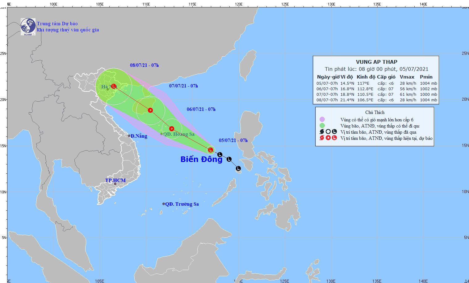 Dự báo trong 24 giờ tới, vùng áp thấp di chuyển theo hướng Tây Bắc, mỗi giờ đi được khoảng 20km và có khả năng mạnh lên thành áp thấp nhiệt đới. Đến 7 giờ ngày 6.7, vị trí tâm áp thấp nhiệt đới ở khoảng 16,8 độ Vĩ Bắc; 112,8 độ Kinh Đông, ngay trên khu vực quần đảo Hoàng Sa. Sức gió mạnh nhất vùng gần tâm áp thấp nhiệt đới mạnh cấp 6-7 (40-60km/giờ), giật cấp 9.