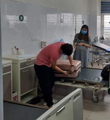 Vợ chồng sản phụ Nguyễn Thị Thanh chuẩn bị hành lý về quê