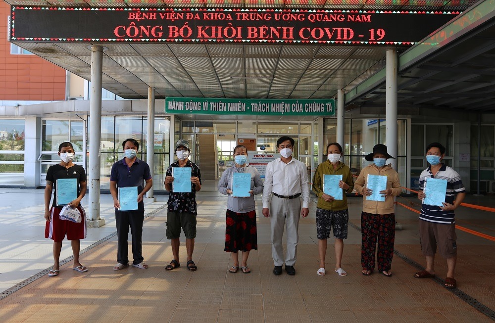 Trong đó, 7 trường hợp được chữa khỏi bệnh tại Bệnh viện Đa khoa Trung ương Quảng Nam gồm: BN722 (28 tuổi, trú xã Duy Trung, huyện Duy Xuyên), BN591 (63 tuổi, trú xã Duy Phước, huyện Duy Xuyên), BN460 (49 tuổi, trú xã Đại Nghĩa, huyện Đại Lộc), BN776 (62 tuổi, trú xã Duy Phước, huyện Duy Xuyên), BN671 (33 tuổi, trú xã Duy Sơn, huyện Duy Xuyên), BN672 (37 tuổi, trú xã Đại Hiệp, huyện Đại Lộc), BN882 (51 tuổi, trú thị trấn Nam Phước, huyện Duy Xuyên).