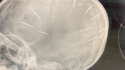 Hình ảnh X.Q có đinh trong hộp sọ của bé A