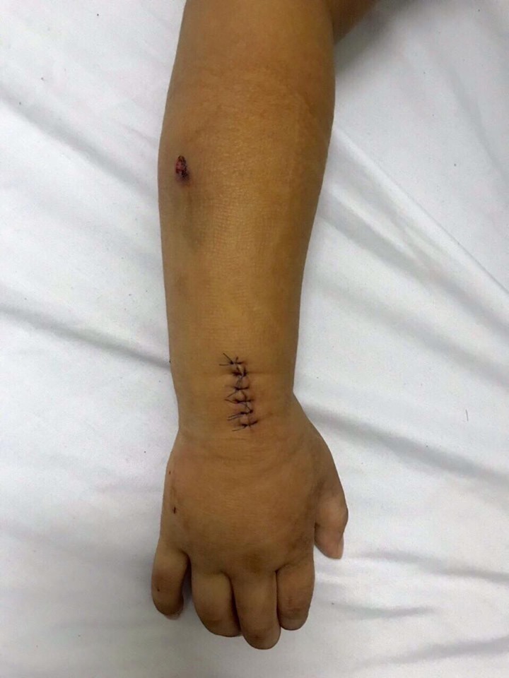 Bé sau khi phẫu thuật lấy bị đạn súng hơi găm vào tay