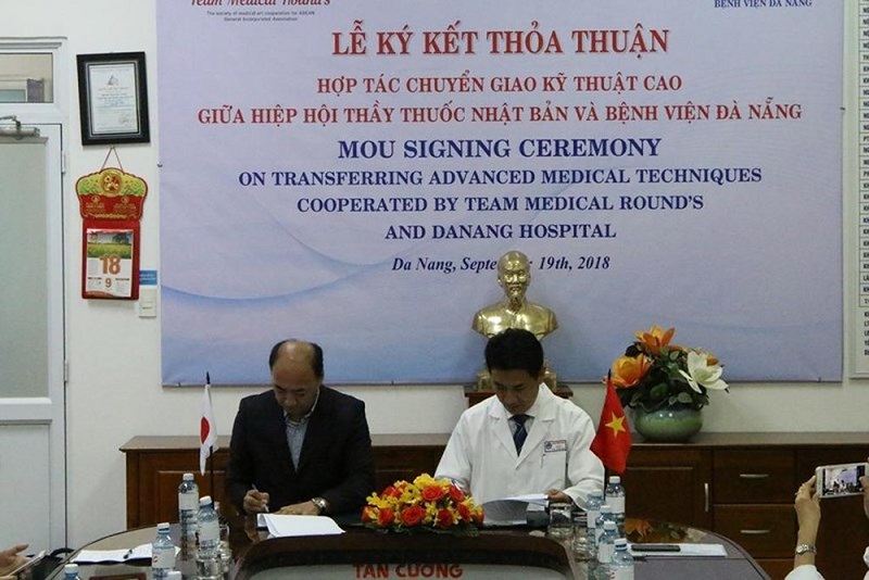 Giám đốc BV Đà Nẵng Lê Đức Nhân và ông Shuji Machiyama - Giám đốc Hiệp hội Y bác sĩ Việt Nhật, ký kết biên bản ghi nhớ cấy ghép nội tạng