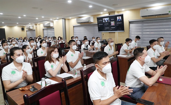 Các bác sĩ, điều dưỡng, kỹ thuật viên dự buổi lễ xuất quân và cùng lãnh đạo Bệnh viện thể hiện quyết tâm chiến thắng dịch  Covid-19