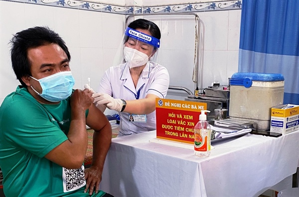Điều dưỡng Nguyễn Thị Hằng, Trạm trưởng Trạm y tế thị trấn huyện Hòn Đất đang tiêm vắc xin phòng, chống Covid-19 cho người dân