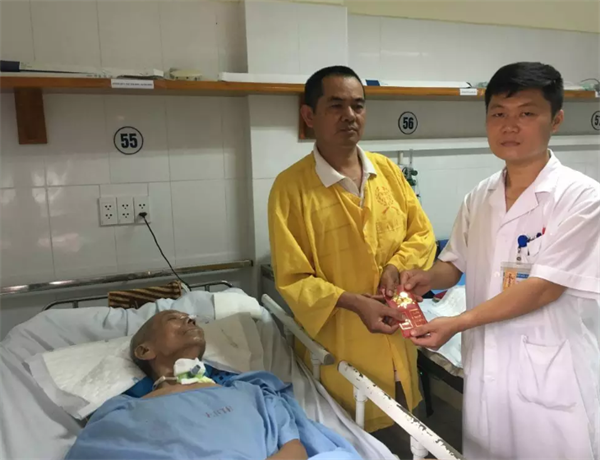 Ông Nguyễn Duy Đức nhận quà của BV Hữu nghị Việt Đức trước khi đưa bố mình trở về quê nhà chăm sóc