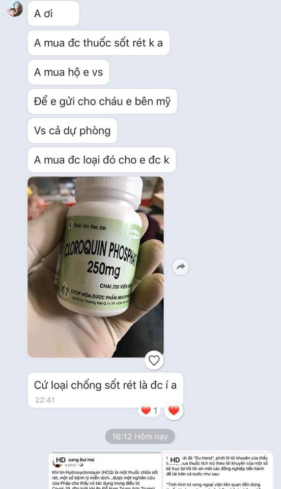 Hơn nữa, các chuyên gia cũng khuyến cáo, Việt Nam có sẵn nguyên liệu và sản xuất số lượng lớn loại thuốc này vì sốt rét là một trong những bệnh phổ biến, cần loại trừ ở Việt Nam chứ không hiếm như các nước ôn đới. Cho đến nay Bộ Y tế vẫn chưa có khuyến cáo một cách chính thức về việc sử dụng thuốc HCQ cho dự phòng hay chữa bệnh Covid-19. Vì vậy, cộng đồng cần tuân thủ đầy đủ khuyến cáo của Bộ Y tế, có bệnh, nghi ngờ có bệnh cần tư vấn thầy thuốc, tuyệt đối không tự ý mua thuốc HCQ để uống nhằm mục đích dự phòng hoặc điều trị tránh hậu quả đáng tiếc có thể xảy ra.