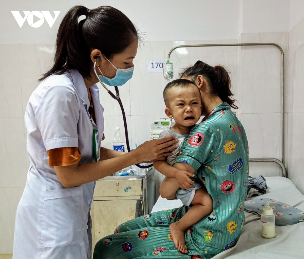 Bác sĩ khoa Nhi Bệnh viện Đa khoa vùng Tây Nguyên thăm khám cho trẻ bị bệnh tay chân miệng