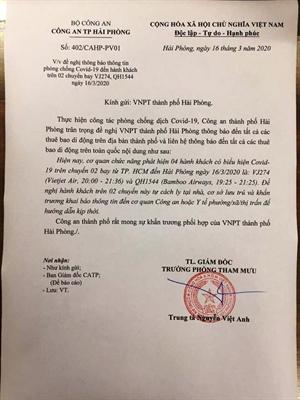 Ngày 17.3, Công an TP Hải Phòng ra văn bản đề nghị thông báo tới các hành khách trên 2 chuyến bay VJ274, QH1544 vào ngày 16.3 tự cách ly và khẩn trương khai báo tới cơ quan chức năng khi trên 2 chuyến bay này có 4 người có dấu hiệu nhiễm Covid-19. Theo Công an TP Hải Phòng, hiện cơ quan chức năng phát hiện 4 hành khách có biểu hiện mắc Covid-19 trên 2 chuyến bay từ TP Hồ Chí Minh đến TP Hải Phòng ngày 16.3 là VJ274 của hãng Vietjet Air bay từ 20h00 – 21h36 và QH1544 của hãng Bamboo Airways bay từ 19h25 – 21h25. Công an TP Hải Phòng đề nghị Công ty VNPT TP Hải Phòng thông báo đến các thuê bao di động trên địa bàn thành phố và liên hệ thông báo đến các thuê bao di động trên toàn quốc để các hành khách nắm tình hình, tự cách ly tại nhà, cơ sở lưu trú và khẩn trương khai báo thông tin đến cơ quan Công an hoặc Y tế phường/xã/thị trấn để được hướng dẫn kịp thời.