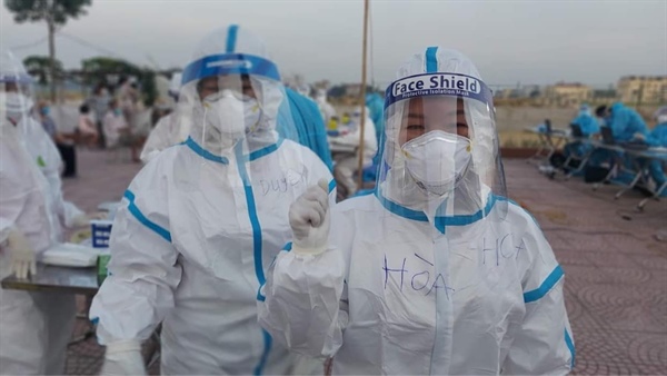 Một nhân viên y tế làm nhiệm vụ truy vết, đón F1 về địa điểm cách ly tập trung tại Bắc Giang chia sẻ: “Bất kể ngày đêm, trưa hay tối, cứ có thông tin F1 là chúng tôi lại lên đường, có hôm còn làm xuyên đêm. Lắm lúc đón một người nhưng phải chờ đợi 2 tiếng mới đón được, mặc quần áo phòng dịch này khó khăn, dù vậy chúng tôi không bao giờ bỏ về”. Hiện có hơn 2.700 cán bộ, nhân viên y tế khắp cả nước đang có mặt ở Bắc Giang để hỗ trợ địa phương này kiểm soát dịch bệnh. Đoàn y tế của Quảng Ninh là một trong những đoàn có mặt sớm nhất và đến nay đã quá nửa tháng. BSCKII Nguyễn Thị Ngọc Điệp, Trưởng khoa Nhi (Bệnh viện Việt Nam – Thụy Điển Uông Bí), Trưởng đoàn bày tỏ: “Thực sự, giữa mùa hè nóng bức, khoác trên mình đồ bảo hộ kín mít và chỉ nhìn thấy nhau qua ánh mắt. Nhưng cái nắng cái nóng của Bắc Giang cũng không làm khó được tinh thần cả đội. Hiện tại, đội bố trí thời gian triển khai công việc từ sáng sớm đến trưa nắng nóng sẽ nghỉ và chiều tối tiếp tục, có khi làm đến đêm”.