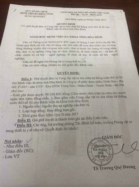 Tuy nhiên, nếu thay theo yêu cầu thực tế thì giá trị của hợp đồng sẽ vượt quá 100 triệu đồng, mà theo quy định thì với giá trị hợp đồng từ 100 triệu đồng trở lên BV đa khoa tỉnh Hòa Bình phải báo cáo Sở Y tế. Nhưng Giám đốc Bệnh viện và Phòng vật tư đã lách quy định này bằng cách thay hai màng lọc để giá trị Hợp đồng lần thứ 17 chỉ là 99.360.800 đồng (?).