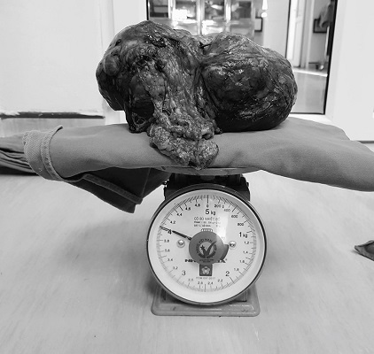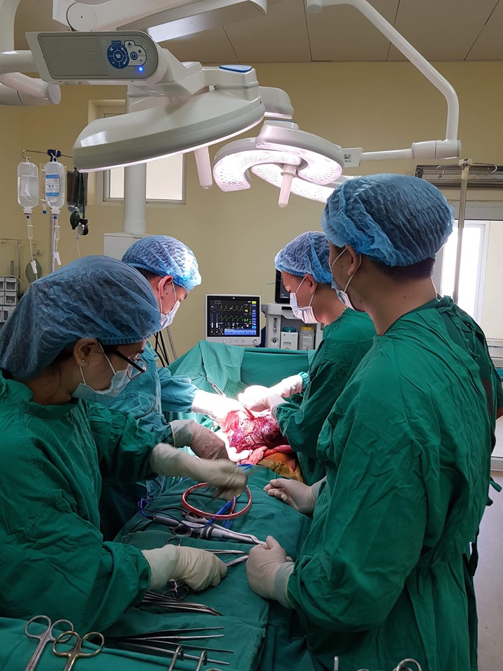 Bệnh nhân sau đó được chỉ định phẫu thuật cắt bỏ khối u, dự trù máu cho phẫu thuật. Ê kip phẫu thuật của Bệnh viện K Trung ương gồm phẫu thuật viên chính là Ts.Bs Phạm Thế Anh, phụ phẫu thuật là Ths.Bs Nguyễn Kiều Hưng, Bs Phạm Bá Đức, bác sĩ gây mê Trịnh Thị Yến tiên lượng ca mổ sẽ rất khó khăn do khối u kích thước quá lớn, nguy cơ mất nhiều máu trong mổ rất cao và quyết định sử dụng đường mở bụng rộng rãi. “Khi mở bụng xong, khoang ổ bụng lộ ra với hình ảnh một khối u khổng lồ choán toàn bộ khoang ổ bụng, u nằm đè lên các quai ruột và đẩy một số quai xuống tiểu khung, thùy gan trái bị đẩy lên cao. Bề mặt khối u có rất nhiều mạch máu tăng sinh, tăng kích thước. Khối u xâm lấn một phần vào nhu mô gan hạ phân thuỳ 5. Tiếp tục phẫu tích bóc tách khối u khỏi các thành phần xung quanh trong ổ bụng thì phát hiện khối u có nguồn gốc từ mạc treo đại tràng vùng góc gan”, đại diện ê kíp phẫu thuật cho hay.