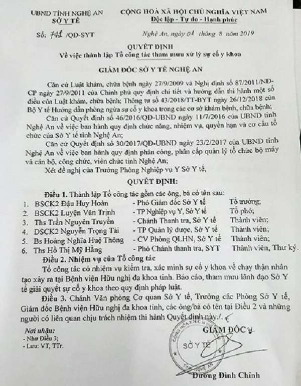 Quyết định thành lập Tổ công tác tham mưu xử lý sự cố y khoa tại Bệnh viện Hữu nghị Đa khoa Nghệ An.
