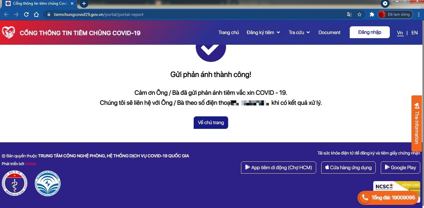 Bước 5: Nhập mã OTP nhận được từ hệ thống TIEM CHUNG gửi tới số điện thoại đăng ký ở bước 2,  và bấm “Xác nhận” để kết thúc phản ánh.