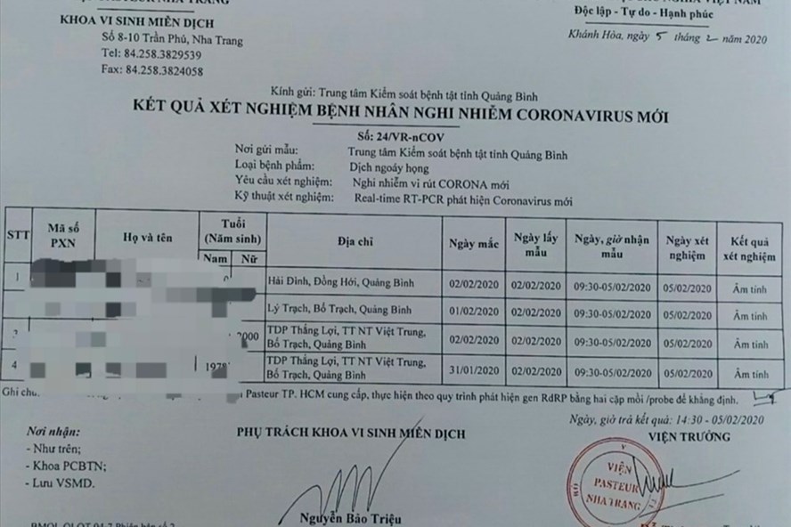 VHO - Chiều 5.2, Viện Pasteur Nha Trang đã công bố kết quả xét nghiệm của 4/4 mẫu bệnh phẩm do Trung tâm Kiểm soát bệnh tật Quảng Bình gửi đến. Kết quả, cả 4 trường hợp đều âm tính với virus corona.