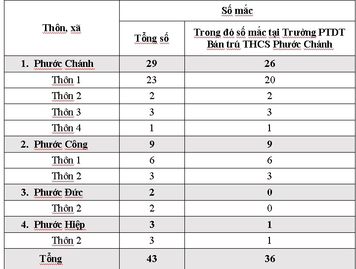 Ban chỉ đạo phòng, chống dịch bệnh Covid-19 tỉnh Quảng Nam cho biết, trong 3 ngày, từ ngày 12-14.10, trên địa bàn huyện miền núi Phước Sơn ghi nhận 43 ca mắc Covid-19, cụ thể, tại xã Phước Chánh 29 ca; Phước Công 9 ca; Phước Đức 2 ca; Phước Hiệp 3 ca. Trong số đó, có 36 trường hợp là học sinh, giáo viên tại Trường PTDT Bán trú THCS Phước Chánh, huyện Phước Sơn.