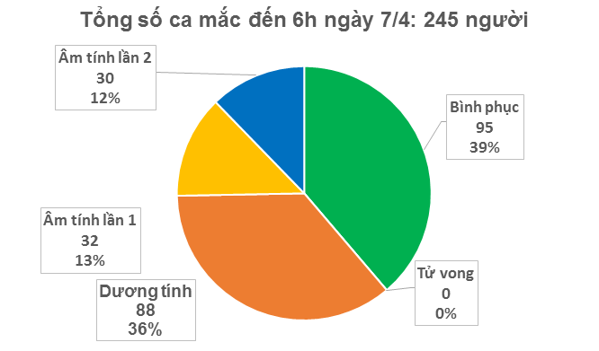 VHO - Bộ Y tế cho biết, đến 6h sáng ngày 7.4, Việt Nam không có trường hợp mắc mới Covid-19, Việt Nam ghi nhận 245 trường hợp, trong đó 62 bệnh nhân có kết quả xét nghiệm âm tính từ 1 lần trở lên.