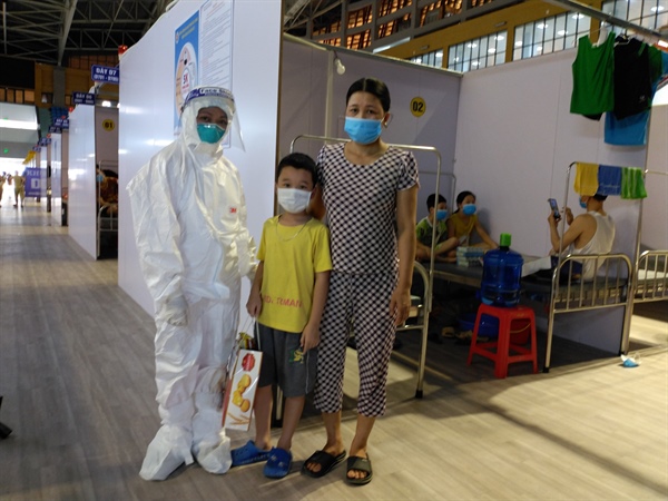 Bệnh viện Dã chiến số 2 được đặt tại Nhà thi đấu thể thao tỉnh Bắc Giang hiện đang là nơi cách ly, điều trị gần 700 trường hợp liên quan tới các ca nhiễm Covid-19. Phần lớn đây là những công nhân làm việc tại các khu công nghiệp trên địa bàn tỉnh với 15 em nhỏ. Em nhỏ nhất mới 1 tuổi và em lớn nhất cũng vừa bước qua sinh nhật lần thứ 10.