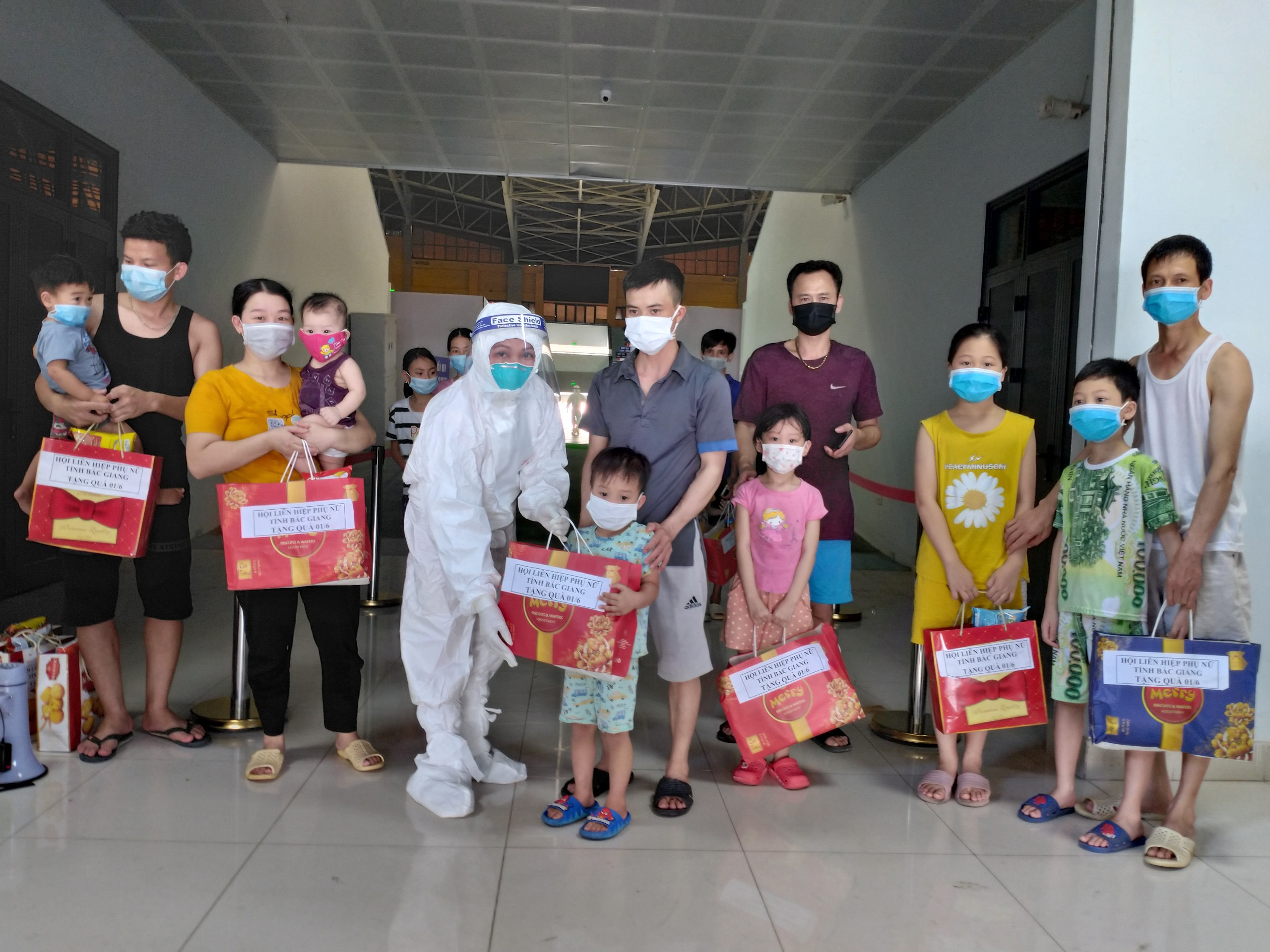 Mong muốn mang Tết Thiếu nhi đến cho trẻ em ở các khu cách ly, phong tỏa chính quyền tỉnh Bắc Giang đã kết hợp cùng cán bộ, y bác sĩ của bệnh viện dã chiến tổ chức tặng quà cho các bạn nhỏ tại đây vào ngày 31.5. Những chú gấu bông ngộ nghĩnh, những quyển truyện tranh rực rỡ màu sắc, cùng nhiều phần quà khác tuy nhỏ bé nhưng phần nào giúp các em cảm nhận được không khí của ngày Tết đặc biệt này.