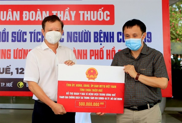 Dịp này, nhiều cơ quan, tổ chức đã trao tặng quà hỗ trợ, động viên đoàn y, bác sĩ lên đường hoạt động Trung tâm Hồi sức Covid-19 Trung ương Huế tại TP.Hồ Chí Minh. Trong đó, tỉnh Thừa Thiên Huế trao tặng đoàn 500 triệu đồng. Dự kiến trong ngày 13.8, các cán bộ của Bệnh viện Trung ương Huế tiếp tục vận chuyển trang thiết bị, máy móc vào TP.Hồ Chí Minh để bổ sung cho công tác điều trị bệnh nhân Covid-19 nặng.