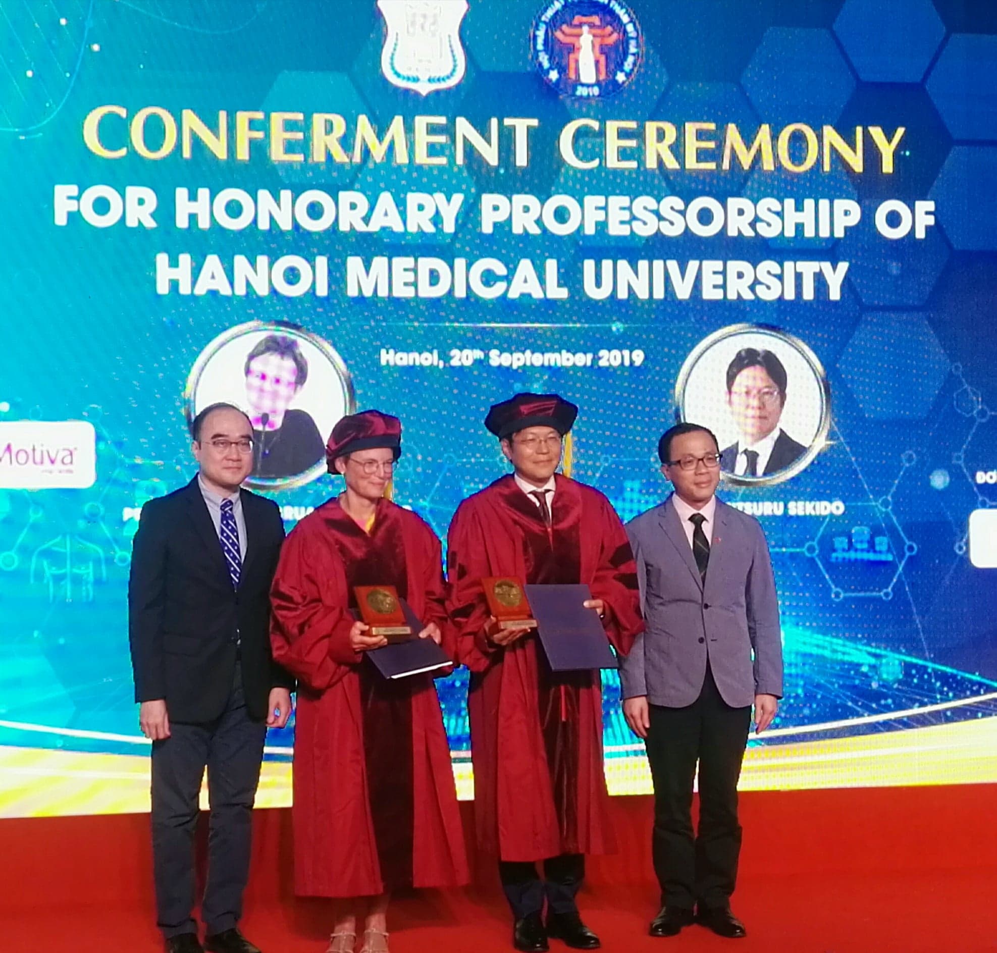 GS Bruant Rodier của trường Strasbourgh (CH Pháp) và GS Sekido của trường Tsukuba (Nhật Bản) đã gắn bó và có những cống hiến quý giá cho việc đào tạo và hỗ trợ các bác sĩ nội trú bộ môn phẫu thuật thẩm mỹ của Việt Nam trong suốt những năm qua. Trước sự chứng kiến của các nhà khoa học, y bác sĩ trong ngành phẫu thuật tạo hình - thẩm mỹ trong nước và quốc tế, hai GS đến từ Pháp và Nhật Bản đã vinh dự nhận danh hiệu GS danh dự của Trường ĐH Y khoa Hà Nội. Tại buổi lễ, GS.TS Tạ Thành Văn cho biết hai GS đã nhận được 100% phiếu bầu của Hội đồng khoa học Nhà trường và mong rằng, hai GS sẽ tiếp tục đóng góp, cống hiến cho Trường ĐH Y Hà Nội cũng như các trường ĐH tại Pháp và Nhật Bản.