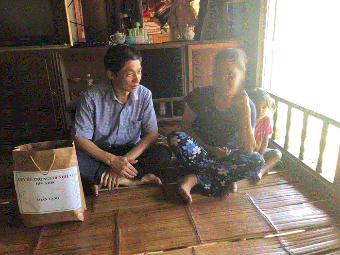 Ông Nguyễn Hoàng Long (trái) thăm một trong 42 bệnh nhân mới mắc HIV tại xã Kim Thượng