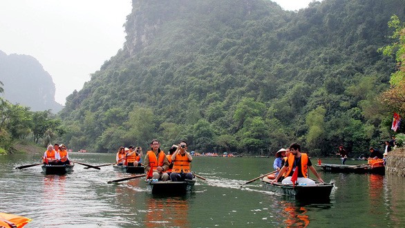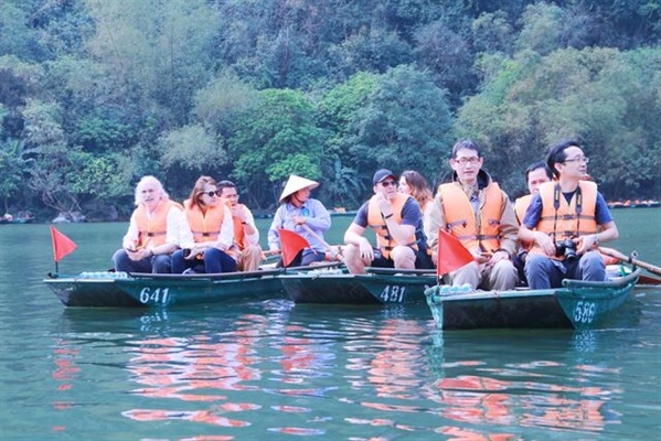 Các phóng viên quốc tế tham quan Di sản thế giới Tràng An Ảnh: TTXVN