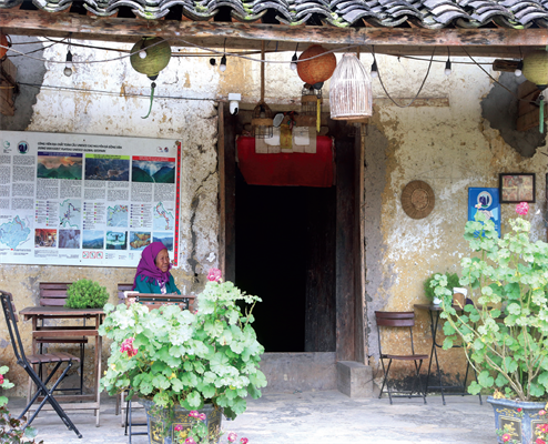 Đi trên con đường uốn lượn trong ngôi làng đẹp như cổ tích, đoàn khách lạc vào ngôi nhà cổ trên 100 tuổi. Nhìn hoa nở từ ngoài ngõ nở vào trong nhà là biết, dù dịch Covid-19 ngăn cản bước chân du khách thì chủ nhà vẫn kiên nhẫn chăm chút nhà cửa và chờ đợi ngày có người đến ngắm nhà mình. Chủ nhà đi vắng, chỉ có một người phụ nữ lớn tuổi ngồi lặng lẽ nơi bậu cửa, hiền từ nhìn khách, cười móm mém mời vào chơi.