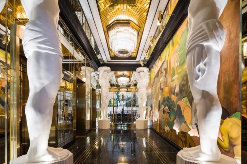 Bước chân vào sảnh thang máy khách sạn, du khách sẽ được chiêm ngưỡng 4 bức tượng lớn được Bill Bensley đặt tên là Carotids. Đây được xem là một trong những nét kiến trúc không thể thiếu của thiết kế nhà hát vào thời kỳ hoàng kim.