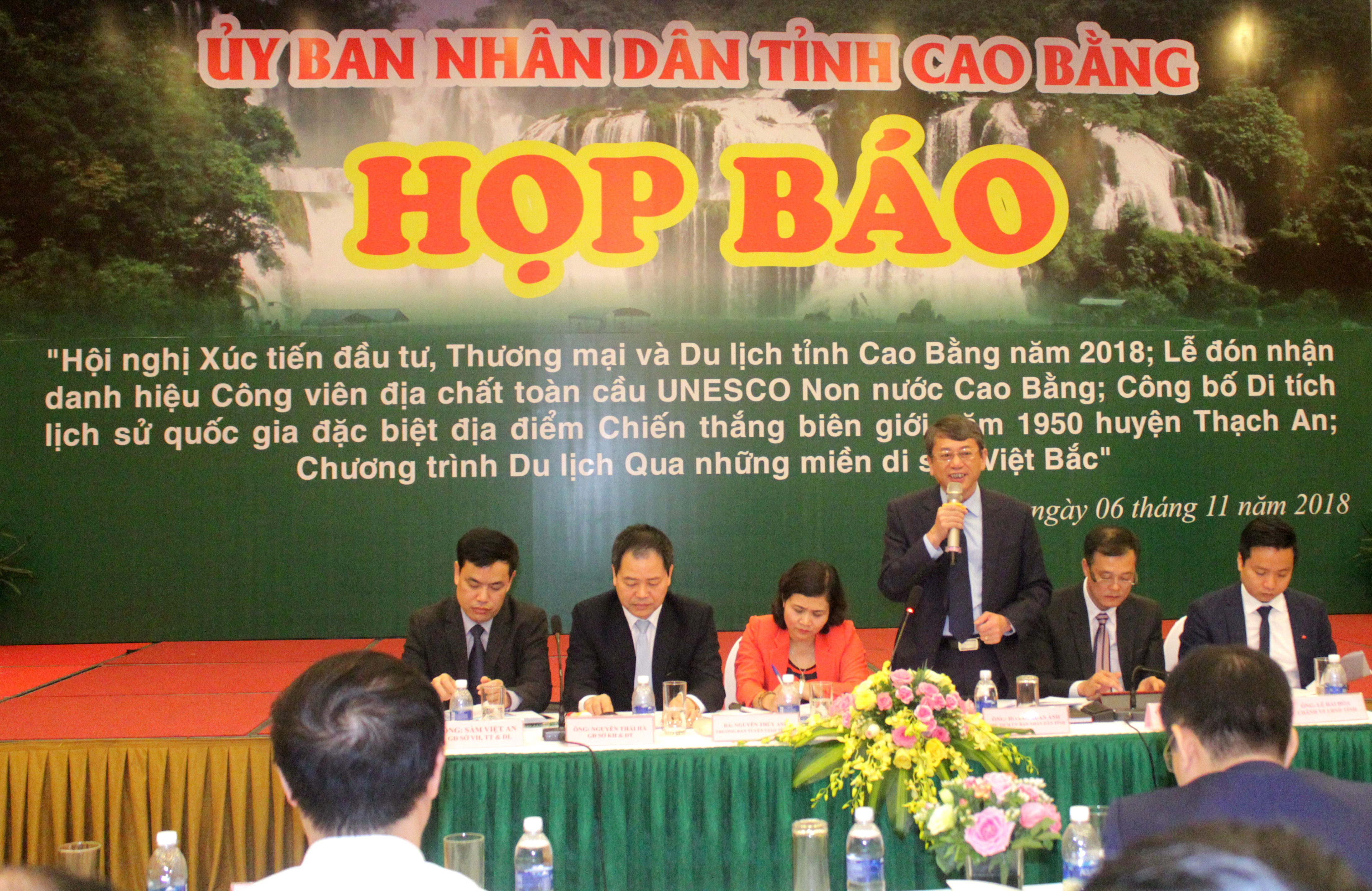 Cùng thời gian này, tỉnh sẽ tổ chức lễ đón nhận danh hiệu Công viên địa chất toàn cầu UNESCO Non nước Cao Bằng; Công bố Di tích lịch sử địa điểm Chiến thắng Biên giới năm 1950 huyện Thạch An là Di tích Quốc gia đặc biệt gắn với lễ khai mạc Chương trình du lịch Qua những miền di sản Việt Bắc 2018. Các hoạt động sẽ diễn ra từ ngày 23 - 27.11 tại thành phố Cao Bằng. Với sự tham dự của gần 400 đại biểu gồm các đồng chí lãnh đạo Chính phủ, lãnh đạo các Bộ, ngành Trung ương; lãnh đạo UBND một số tỉnh, thành phố; các doanh nhân, nhà đầu tư; các cơ quan thông tấn, báo chí Trung ương, địa phương; lãnh đạo tỉnh Cao Bằng.