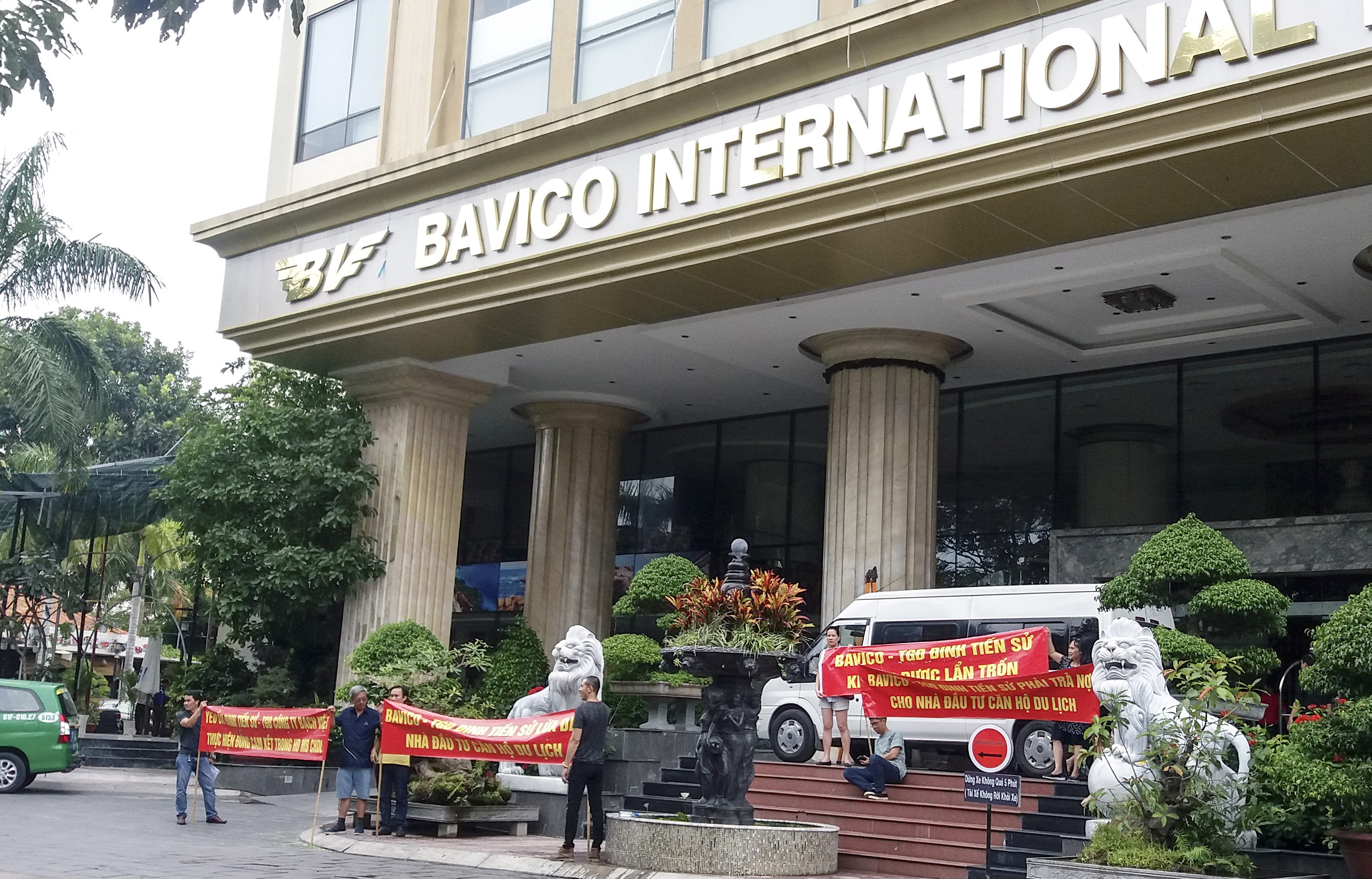 Khách hàng căng băng rôn tố cáo ông Đinh Tiến Sử trước khách sạn Bavico Nha Trang