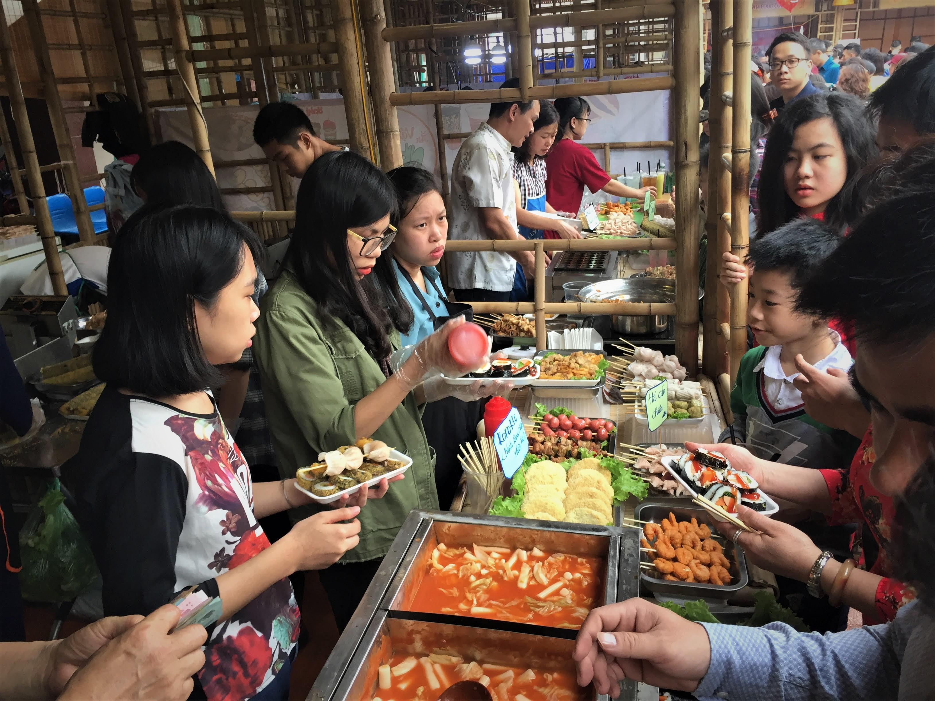 Không gian ẩm thực được chia thành 2 khu: Khu ẩm thực Nhật Bản (gồm 10 gian hàng) trưng bày, chế biến và giới thiệu những món ăn nổi tiếng như: Mì ramen và mì soba (mì nước), bánh takoyaki, sushi và mattra trà xanh nổi tiếng của Nhật Bản. Trong những gian hàng giới thiệu món ăn Nhật luôn đông khách, khách không phải chờ lâu đã được thưởng thức những món ăn đặc trưng của xứ sở mặt trời mọc, tham gia hành trình trải nghiệm, khám phá các món ăn vô cùng mới mẻ, thú vị.
