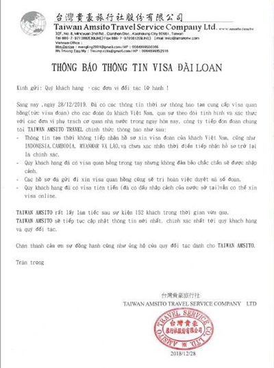 Thông báo của công ty du lịch Đài Loan tới đối tác là công ty du lịch Việt Nam