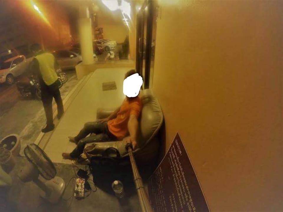 Bạn trẻ đi phượt khoe vừa làm quen với một người bảo vệ ở Thái Lan và xin ngồi trên ghế của chú để ngủ nhờ qua đêm Ảnh: T.L