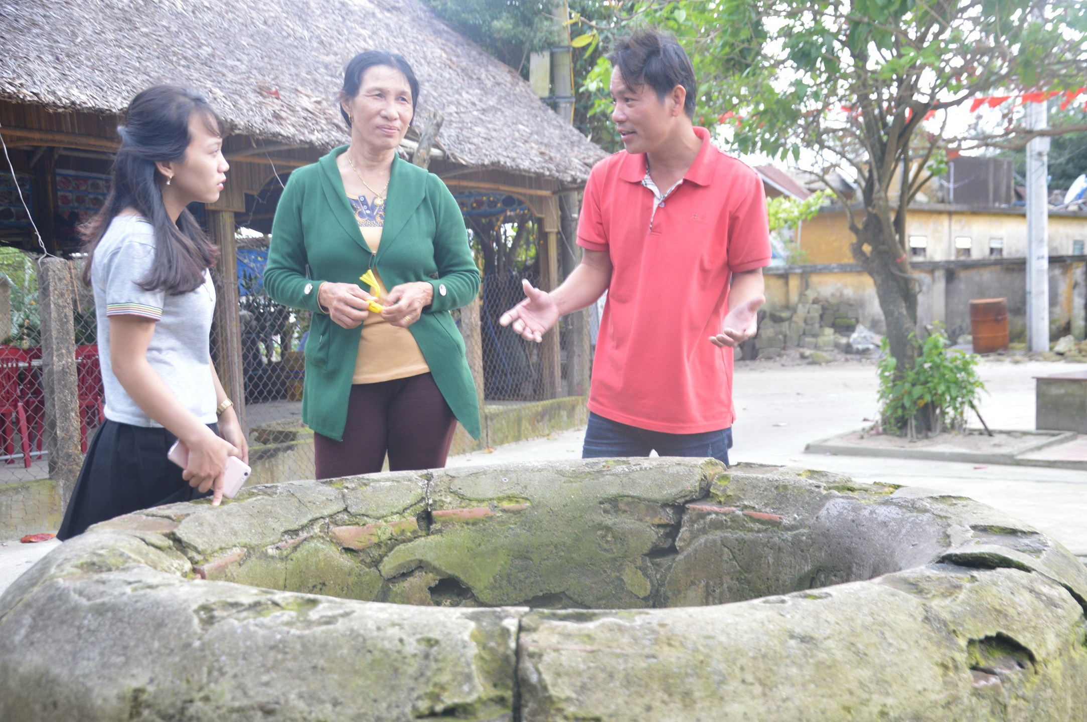 HDV Võ Phúc Sinh (bìa phải) giới thiệu khách tham quan giếng cổ 400 năm tuổi
