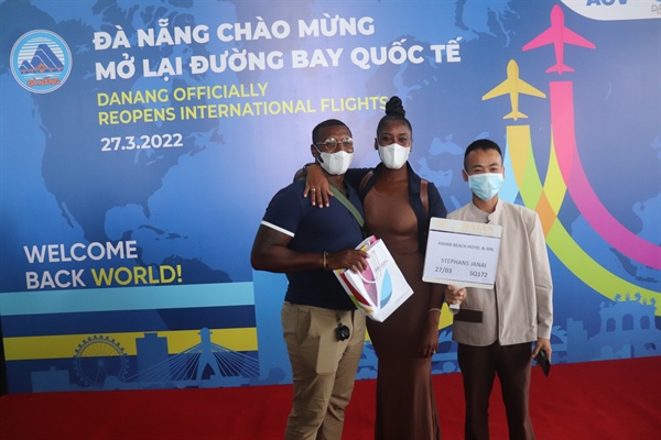 Đón chào những vị khách quý, lãnh đạo UBND thành phố Đà Nẵng đã có mặt để đón và tặng hoa cho hành khách ngay tại sân đỗ máy bay. Tại sân khấu chính ở Ga đến quốc tế cũng tưng bừng diễn ra hoạt động múa lân chào mừng kèm theo những món quà xinh xắn dành tặng cho hơn 300 hành khách trong chuyến bay từ Singapore và Bangkok. Ông Trần Phước Sơn - Phó Chủ tịch UBND TP Đà Nẵng chia sẻ: Sự kiện mở lại đường bay quốc tế có ý nghĩa đặc biệt quan trọng đối với Đà Nẵng, là sự đánh dấu cho giai đoạn tích cực hơn của ngành du lịch nói riêng và toàn thành phố Đà Nẵng trong thời gian tới. Thành phố đánh giá cao các đơn vị, sở ban ngành trong việc chuẩn bị sự kiện này đồng thời cam kết luôn đồng hành tháo gỡ khó khăn, vướng mắc của ngành du lịch, các hãng hàng không theo đúng phương châm “Thích ứng - an toàn - linh hoạt, tiếp nối với những chuyến bay mới và nhiều sự kiện khác về văn hóa, thể thao, du lịch trong thời gian tới.