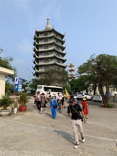 Hướng dẫn viên du lịch dẫn đoàn khách tham quan tại chùa Linh Ứng (Sơn Trà, Đà Nẵng)