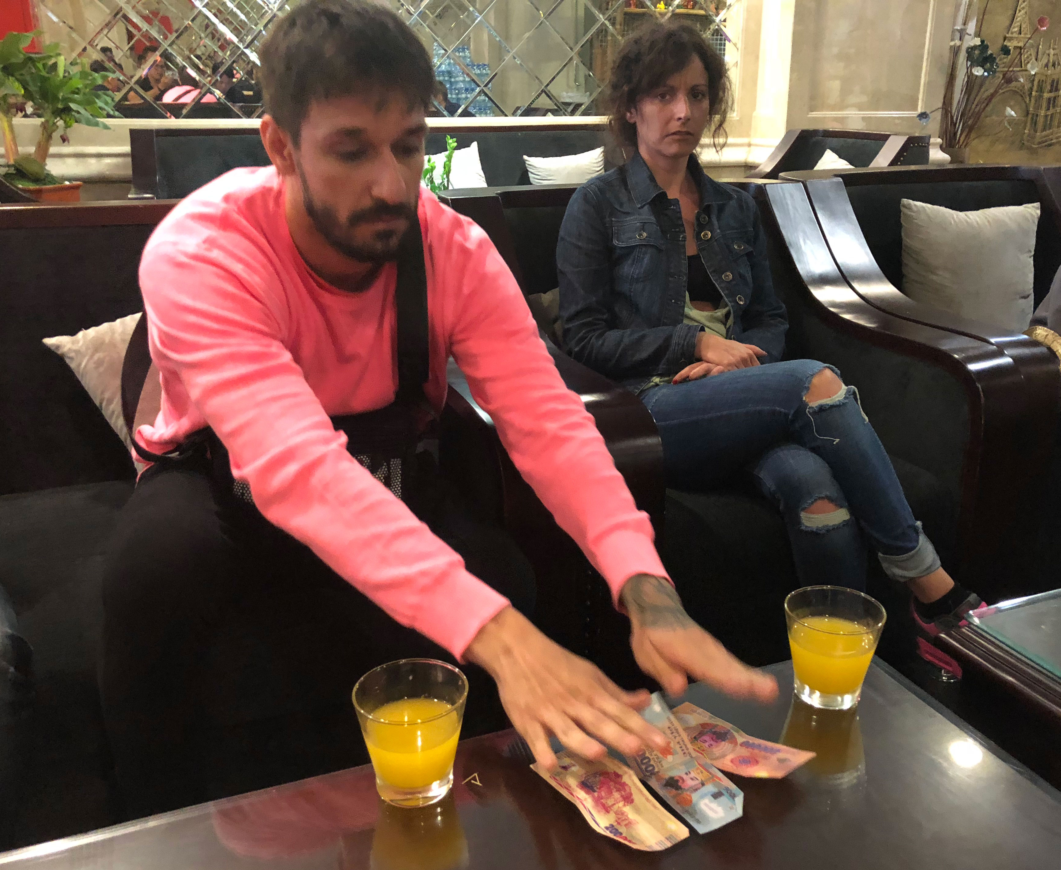 Hai du khách Tây Ban Nha bàn giao số tiền “âm phủ” do tài xế taxi trả lại (ảnh do cơ quan Công an cung cấp)