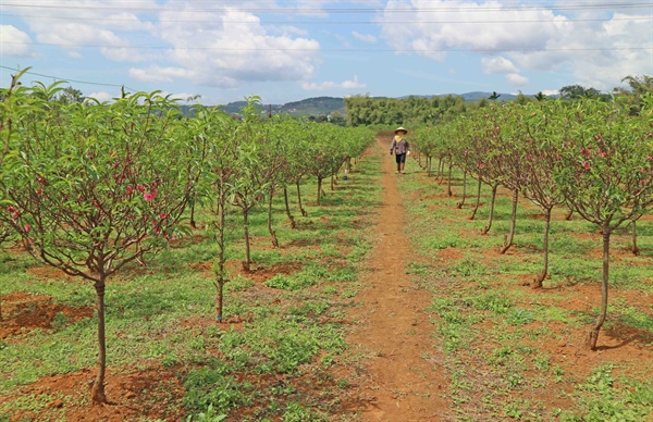 Vườn đào Nhật Tân của gia đình ông Chu Văn Lợi, huyện Lâm Hà, Lâm Đồng có khoảng 400 gốc đào phục vụ Tết 2018