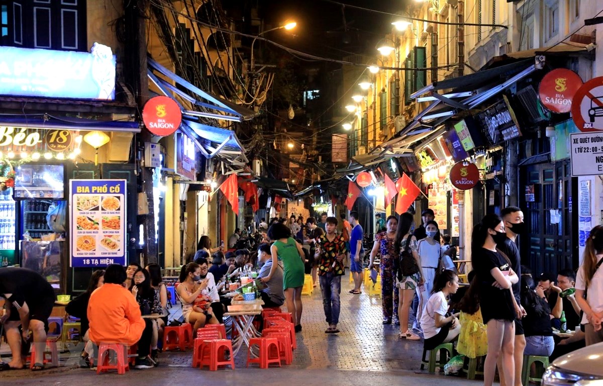 Phố Tạ Hiện, một trong những địa điểm vui chơi về đêm thu hút lượng lớn người dân và khách du lịch ở Hà Nội Ảnh: V.N.P