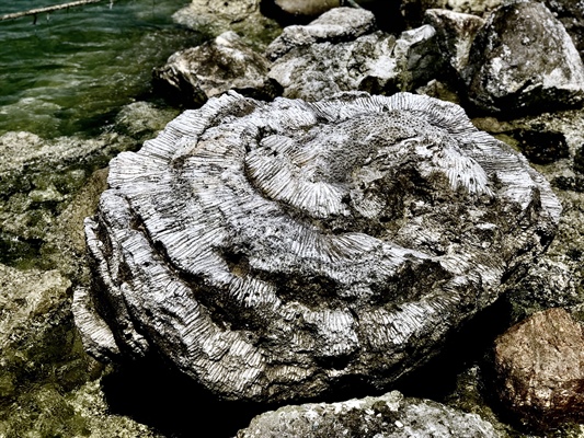 Miệng núi lửa trên đỉnh núi Thới Lới ở đảo Lý Sơn còn khá nguyên vẹn (ảnh lớn), san hô hoá thạch có niên đại 5.000-6.000 năm (ảnh nhỏ)
