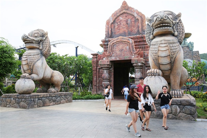 Nếu cụm công trình trên đỉnh Ba Đèo là Nhật Bản thu nhỏ thì có một Campuchia vô cùng kỳ bí được mở ra tại Dragon Park- công viên chủ đề lớn nhất Đông Nam Á, nơi kiến trúc Chăm được tái hiện sinh động ngay lối vào trò chơi Phi long thần tốc, với những bức tượng và kiến trúc đền tháp cổ kính.