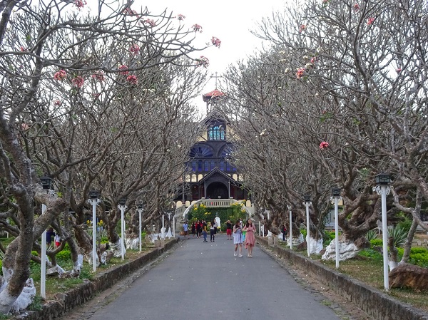 Nằm khuất sau hàng hoa sứ, Tòa giám mục Kon Tum mang dáng vẻ yên bình, tĩnh lặng