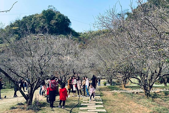 Du khách chụp ảnh tại vườn hoa mận ở Mộc Châu