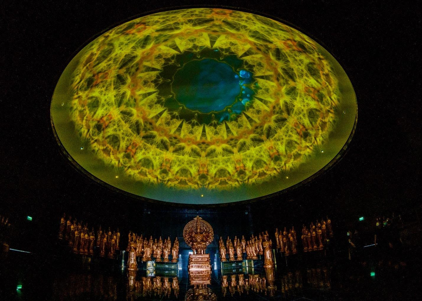 Đặc biệt, tại khu vực Đại sảnh mái vòm tầng 1, du khách có cơ hội tìm hiểu và khám phá về vũ trụ trong quan niệm của Phật giáo thông qua công nghệ chiếu phim video mapping với các thiết bị trình chiếu, âm thanh hiện đại hàng đầu thế giới.