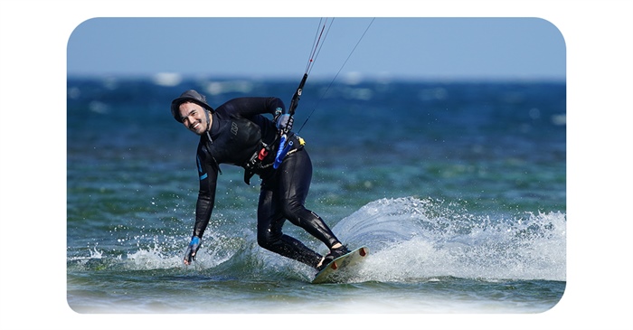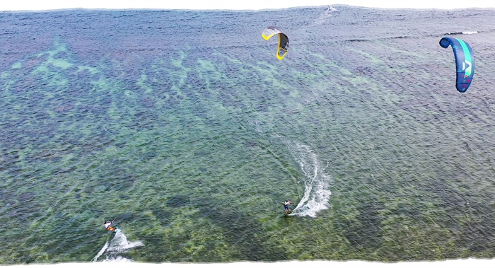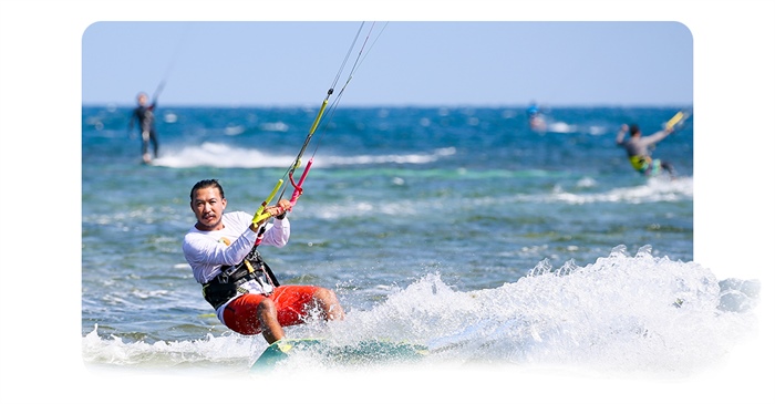 Một tay, anh ôm chặt chiếc ván, tay kia giữ con diều màu xanh lam căng dần trong gió. Cùng những bạn chơi đi bộ khoảng 1km hướng biển, ra đến vùng nước, gió thích hợp, Marconnguyen nghiêng người, nương theo gió mà lướt nhẹ trên những con sóng. Thi thoảng anh lại "phi" vút lên cao, làm một vài động tác nhào lộn đẹp mắt. "Sướng nhất là được về Ninh Thuận lướt ván diều vì có nhiều gió. Gió ở đây mát lành, thổi một chiều, đưa con diều bay cao, giúp người chơi thoả sức bay lượn giữa sóng biển, mây trời", travel blogger chia sẻ.