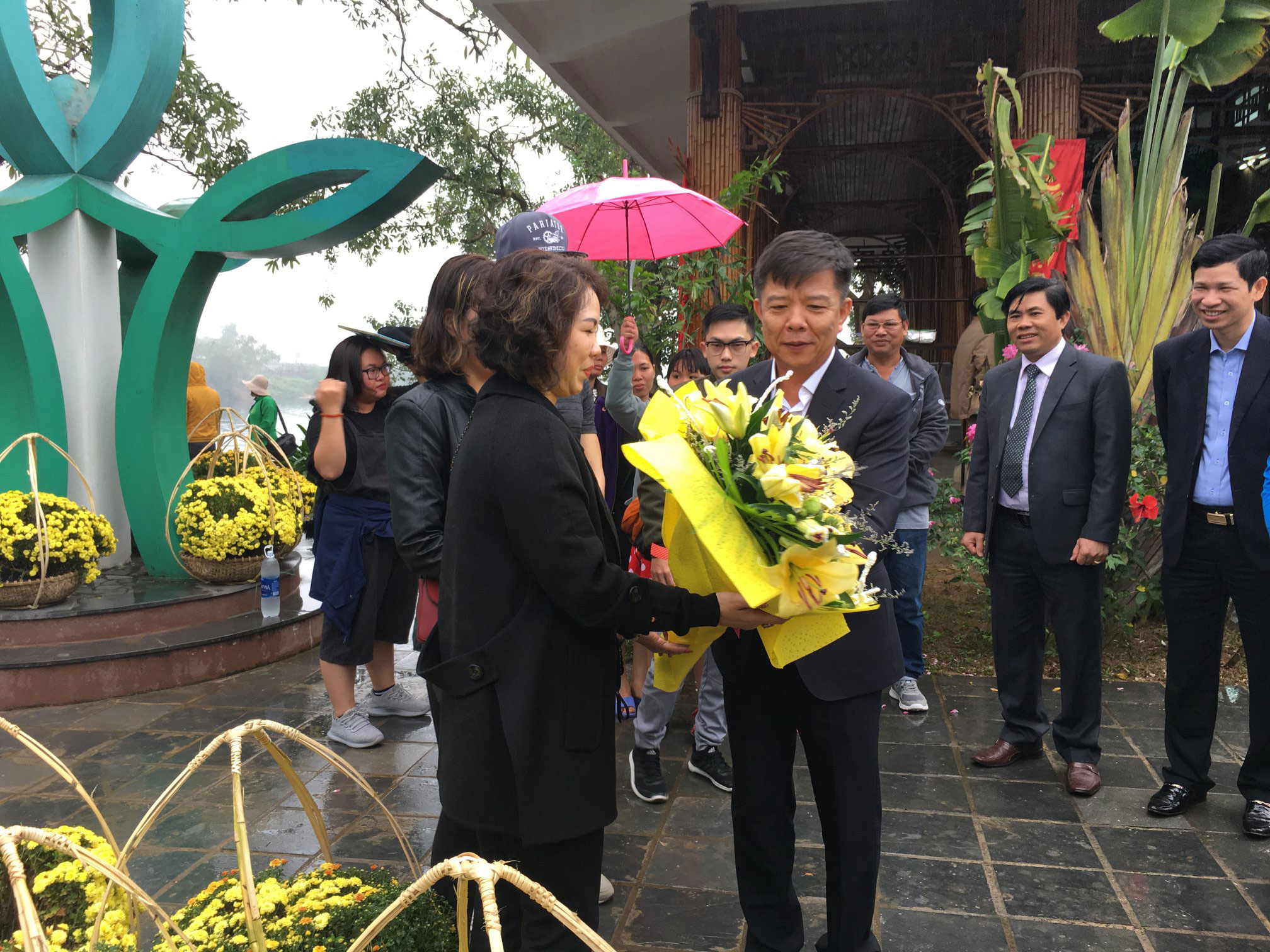 Chủ tịch UBND tỉnh Quảng Bình Nguyễn Hữu Hoài tặng hoa chúc mừng du khách tại chợ Tết quê Phong Nha – Kẻ Bàng