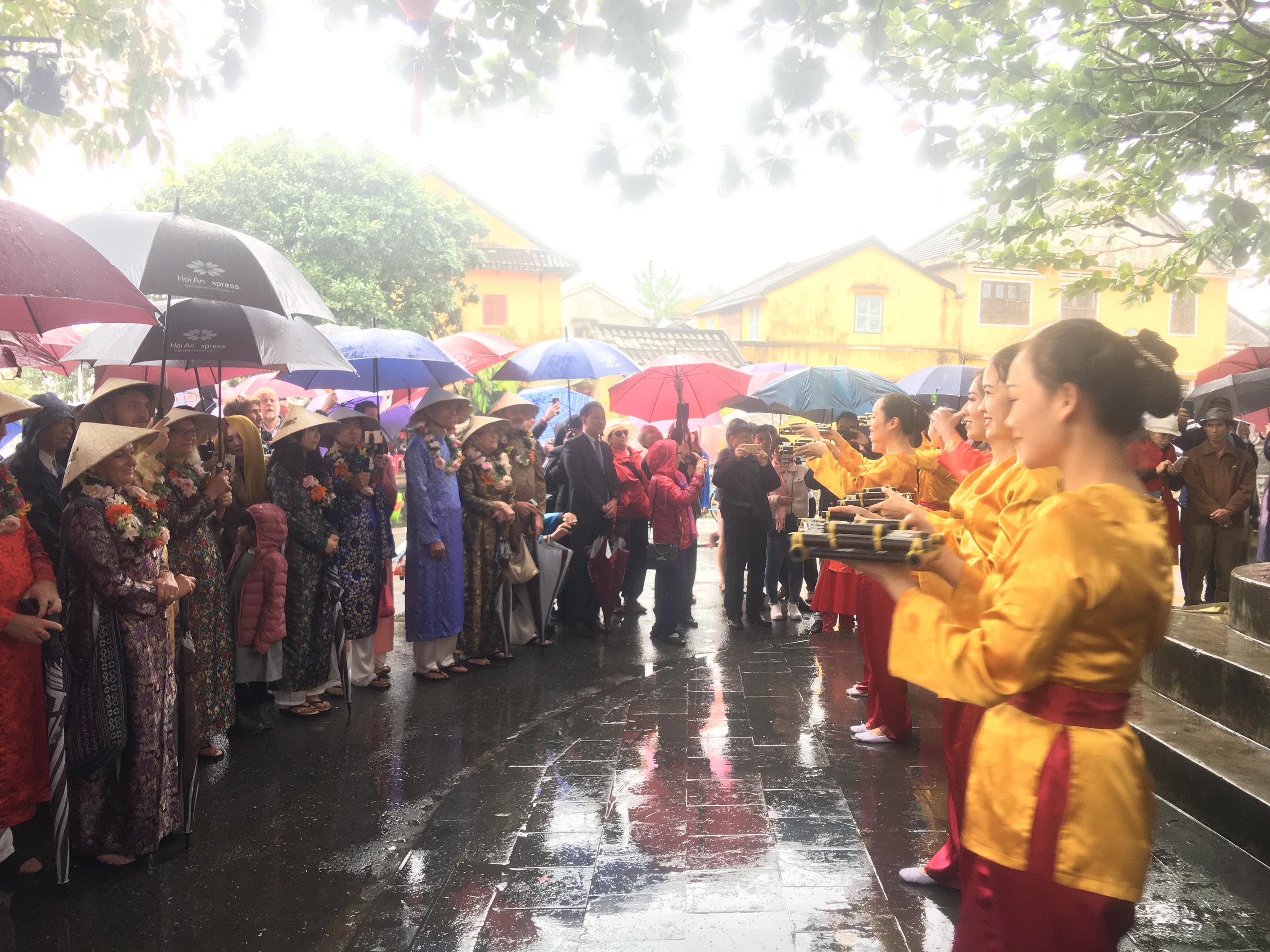 Ông Võ Văn Tân, Phó Chủ tịch UBND tỉnh Quảng Nam cùng đại diện lãnh đạo ngành du lịch, TP Hội An… đã trân trọng chào đón, tặng hoa và quà cho đoàn khách. Dù trời mưa, giá rét, nhưng đoàn khách vẫn hào hứng cùng đại diện lãnh đạo tỉnh Quảng Nam và TP Hội An tham quan và thưởng thức trà đạo Nhật Bản tại Không gian văn hóa Việt - Nhật, một sản phẩm du lịch mới của TP Hội An. Sau đó đoàn cũng đã tham quan phố cổ, thưởng thức nghệ thuật truyền thống Quảng Nam, đặc biệt là hò khoan đối đáp và bài chòi.